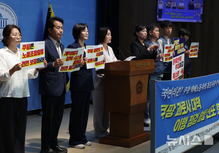 [서울=뉴시스] 고승민 기자 = 진보당 김재연 상임대표와 윤종오 원내대표, 정혜경 의원 등 참석자들이 2일 서울 여의도 국회 소통관에서 쿠팡 청문회 약속이행 점검단 발족 기자회견을 하고 있다. 2025.07.02. [email protected]