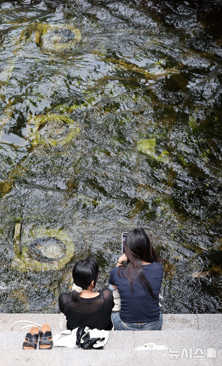 [서울=뉴시스] 배훈식 기자 = 전국 대부분 지역에 폭염특보가 발효된 2일 오후 서울 종로구 청계천을 찾은 시민들이 물에 발을 담그며 더위를 식히고 있다. 2025.07.02. [email protected]