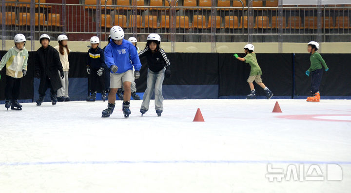 [전주=뉴시스] 김얼 기자 = 연일 무더위가 이어지고 있는 2일 전북 전주시 화산체육관 빙상경기장을 찾은 어린이들이 아이스링크를 타며 더위를 식히고 있다. 2025.07.02. [email protected]