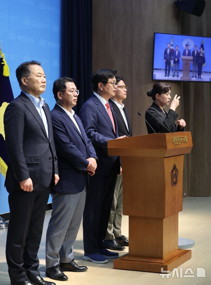 [서울=뉴시스] 조성봉 기자 = 김장겸 국민의힘 의원이 2일 서울 여의도 국회 소통관에서 열린 '민주당 과방위 방송3법 폭주와 일방통행식 소위 운영 규탄' 긴급 기자회견에서 발언을 하고 있다. 왼쪽부터 신성범 의원, 이상휘 의원, 김 의원, 박정훈 의원. 2025.07.02. [email protected]