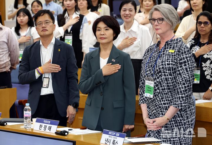 [서울=뉴시스] 조성봉 기자 = 박주민(왼쪽부터), 한정애 더불어민주당 의원, 낸시룩스 INCCIP 대표가 2일 오후 서울 여의도 국회 의원회관에서 열린 2025 INCCIP 제4회 국제 컨퍼런스 국회포럼에서 국민의례를 하고 있다. 이날 포럼에는 수용자 자녀의 회복탄력성과 지원제도에 대해 논의를 진행했다. 2025.07.02. [email protected]