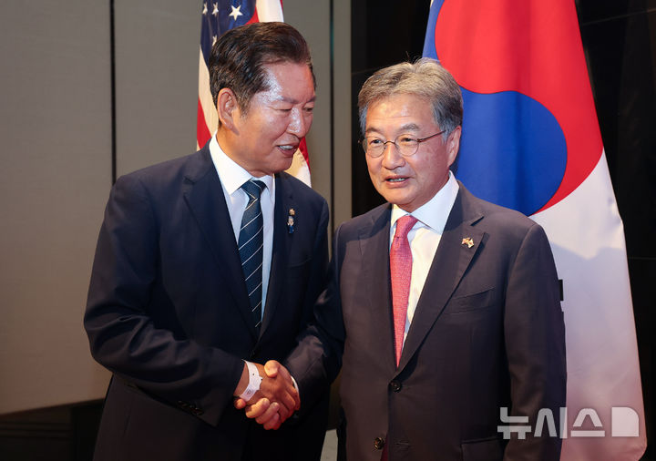 [서울=뉴시스] 사진공동취재단 = 조셉 윤(오른쪽) 주한 미국대사대리와 정청래 더불어민주당 의원이 2일 오후 서울 용산구 그랜드 하얏트 호텔 그랜드 볼룸에서 열린 미국 독립기념일 행사에서 이야기를 나누고 있다. 2025.07.02. [email protected]