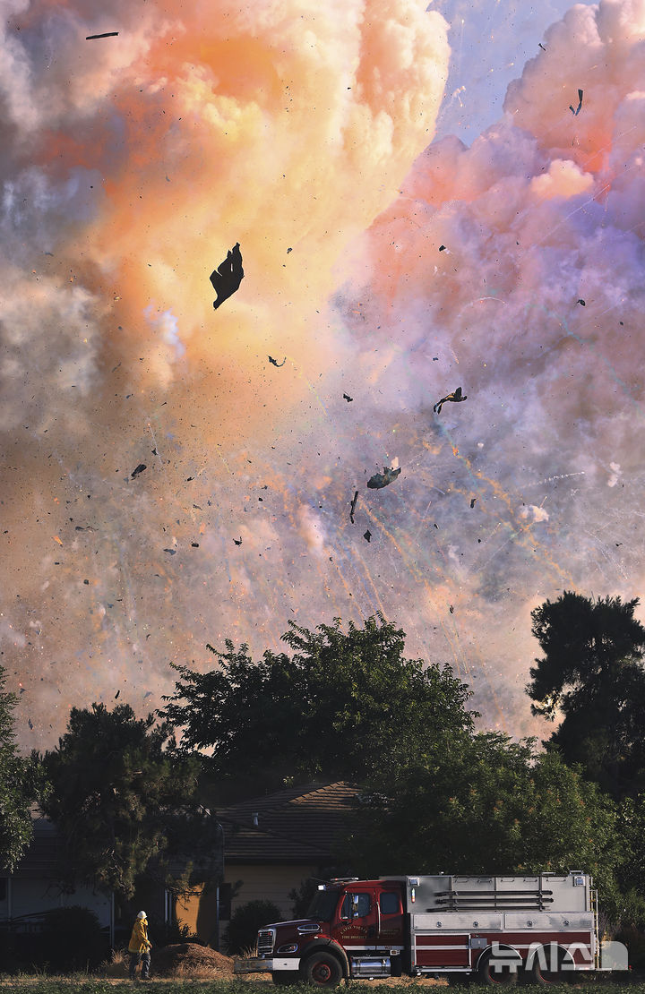[에스파르토=AP/뉴시스] 지난 1일(현지 시간) 미 캘리포니아주 에스파르토 인근의 한 폭죽 창고에서 폭발이 일어나 폭죽이 터지고 있다. 현지 당국은 이 불길이 인근 임야와 농장으로 번져 나가면서 7명이 실종됐고 주변 지역에 강제 대피령이 내려졌다고 2일 발표했다. 2025.07.03.