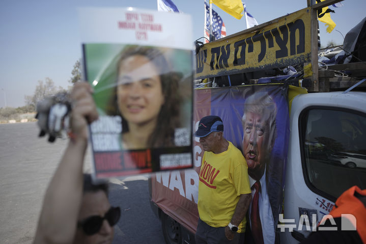 [레임=AP/뉴시스] 2일(현지 시간) 이스라엘 남부 레임 키부츠 인근, 2023년 10월 7일 당시 하마스의 노바 뮤직 페스티벌 공격 현장에서 시위대가 전쟁 중단과 인질 석방을 촉구하며 시위하고 있다. 2025.07.03.