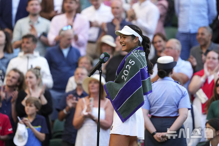 [런던=AP/뉴시스] 에마 라두카누(40위·영국)가 2일(현지 시간) 영국 런던 올잉글랜드 클럽에서 열린 2025 윔블던 테니스 대회 여자 단식 2회전에서 마르케타 본드루소바(73위·체코)를 꺾은 후 소감을 말하고 있다. 라두카누가 2023년 이 대회 우승자인 본드루소바를 2-0(6-3 6-3)으로 물리치고 3회전에 올라 아리나 사발렌카(1위·벨라루스)와 맞붙는다. 2025.07.03.