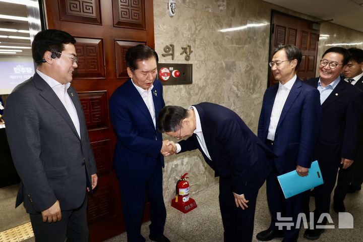 [서울=뉴시스] 조성봉 기자 = 정성호 법무부 장관 후보자가 3일 오후 서울 여의도 국회에서 열린 비공개 의원총회에서 당대표 출마 선언한 정청래,박찬대(왼쪽) 의원에게 허리숙여 인사를 하고 있다.2025.07.03.