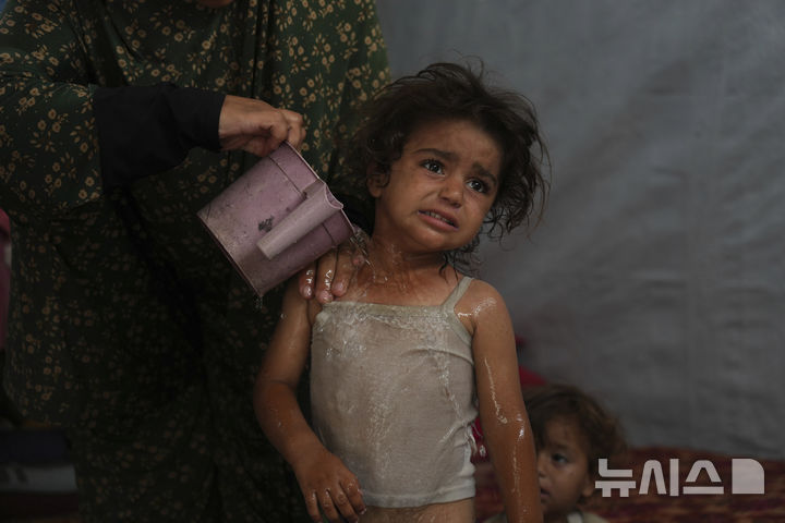 [칸유니스=AP/뉴시스] 지난 1일(현지 시간) 가자지구 남부 칸유니스 난민촌 텐트 안에서 한 팔레스타인 여성이 두 살 된 딸에게 소량의 물을 적셔주며 더위를 식혀주고 있다. 2025.07.03.
