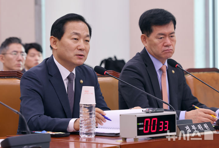 [서울=뉴시스] 김금보 기자 = 이두희(왼쪽) 국방부장관 직무대행이 3일 서울 여의도 국회에서 열린 법제사법위원회 전체회의에서 발언하고 있다. 2025.07.03. [email protected]