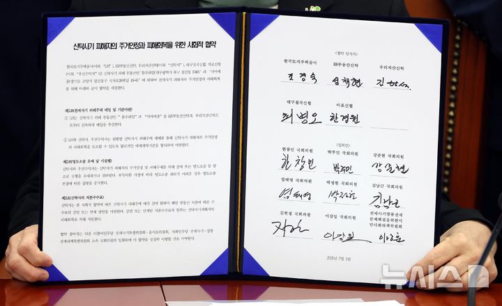 [서울=뉴시스] 조성봉 기자 = 3일 오전 서울 여의도 국회에서 열린 신탁사기 피해자 구제를 위한 사회적 협약식에서 한 참석자고 협약서를 들어보이고 있다.  2025.07.03. [email protected]