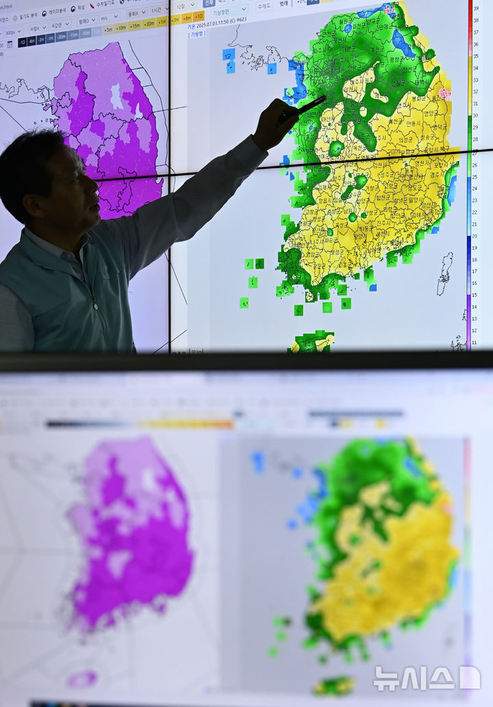 [수원=뉴시스] 김종택 기자 = 전국 대부분 지역에 폭염특보가 발효된 3일 경기 수원시 수도권기상청에서 예보관이 폭염 상황을 모니터링 하고 있다. 2025.07.03. [email protected]