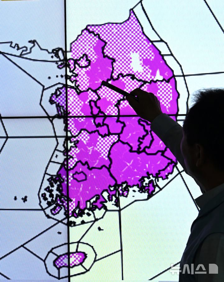 [수원=뉴시스] 김종택 기자 = 전국 대부분 지역에 폭염특보가 발효된 3일 경기 수원시 수도권기상청에서 예보관이 폭염 상황을 모니터링 하고 있다. 2025.07.03. [email protected]