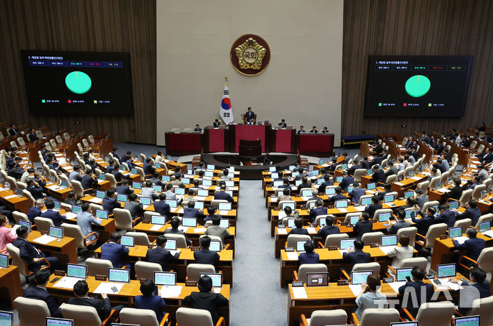 [서울=뉴시스] 고승민 기자 = 3일 서울 여의도 국회에서 열린 제426회 국회(임시회) 제4차 본회의에서 계엄법 일부개정법률안이 재석 259인, 찬성 255인, 기권 4인으로 가결되고 있다. 2025.07.03. [email protected]