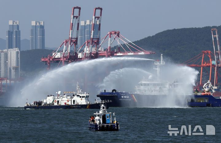 [부산=뉴시스] 하경민 기자 = 3일 부산 영도구 앞 해상에서 열린 '3분기 수난대비 기본훈련'에 참가한 부산해경 방제정이 물대포를 쏘며 화재를 진화하고 있다.