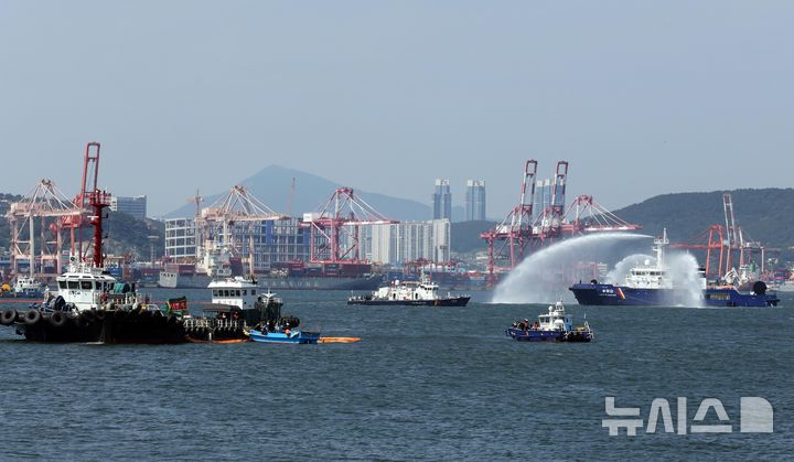 [부산=뉴시스] 하경민 기자 = 3일 부산 영도구 앞 해상에서 열린 '3분기 수난대비 기본훈련'에 참가한 부산해경 방제정이 물대포를 쏘며 화재를 진화하고 있다.