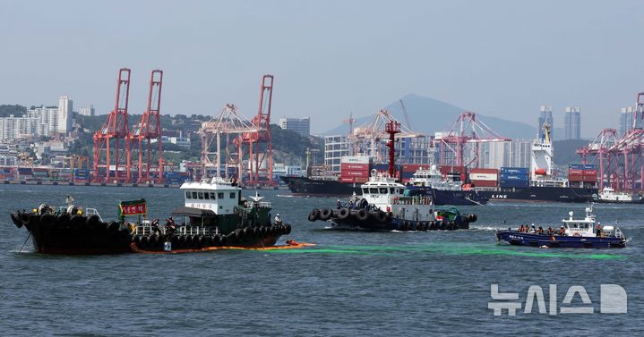 집단계류 선박들이 기상 악화로 홋줄이 끊어지며 해상으로 표류하다가 급유선과 충돌해 추락자가 발생하고 해양오염으로 이어지는 상황을 가정한 이날 훈련에는 부산해경과 중앙해양특수구조단, 부산항VTS, 부산시, 부산지방해수청, 해양재난구조대 등 12개 기관·단체에서 총 17척의 함선이 동원됐다. 2025.07.03. [email protected]