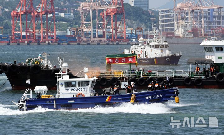 집단계류 선박들이 기상 악화로 홋줄이 끊어지며 해상으로 표류하다가 급유선과 충돌해 추락자가 발생하고 해양오염으로 이어지는 상황을 가정한 이날 훈련에는 부산해경과 중앙해양특수구조단, 부산항VTS, 부산시, 부산지방해수청, 해양재난구조대 등 12개 기관·단체에서 총 17척의 함선이 동원됐다. 2025.07.03. [email protected]