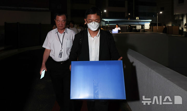 [서울=뉴시스] 김선웅 기자 = 김건희 여사 관련 의혹을 수사 중인 민중기 특별검사팀이 삼부토건에 대한 압수수색에 착수한 3일 서울 종로구 소재 삼부토건 본사가 입주했던 건물에서 특검팀 관계자가 압수수색을 마친 뒤 물품이 담긴 상자를 들고 철수하고 있다. 2025.07.03. [email protected]