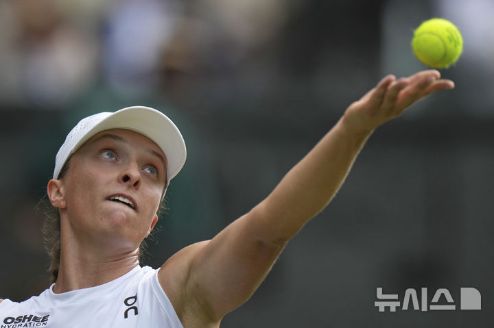 [런던=AP/뉴시스] 이가 시비옹테크(4위·폴란드)가 3일(현지 시간) 영국 런던 올잉글랜드 클럽에서 열린 2025 윔블던 테니스 대회 여자 단식 2회전에서 캐티 맥널리(208위·미국)와 경기하고 있다. 시비옹테크가 2-1(5-7 6-2 6-1) 역전승을 거두고 3회전에 올라 대니엘 콜린스(54위·미국)와 맞붙는다. 2025.07.04.