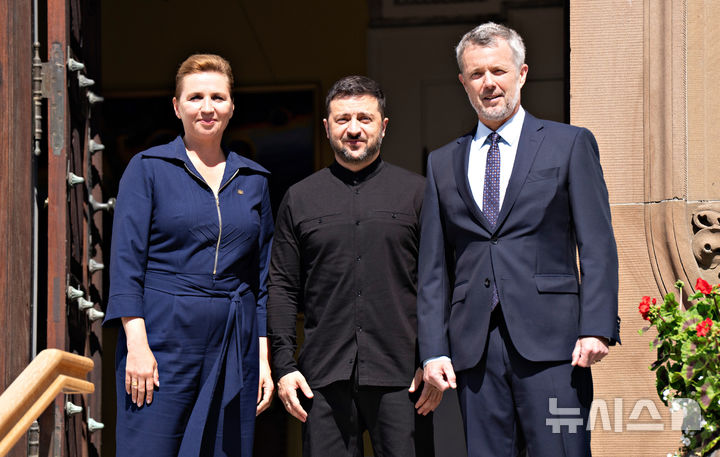 [오르후스=AP/뉴시스] 볼로디미르 젤렌스키(가운데) 우크라이나 대통령이 3일(현지 시간) 덴마크 오르후스의 마르셀리스보르 성에서 열린 덴마크의 유럽연합(EU) 순회 의장국 출범 행사에 참석해 프레데릭 10세(오른쪽) 국왕, 메테 프레데릭센 총리와 기념 촬영하고 있다. 프레데릭센 총리는 우크라이나의 EU 가입을 계속해서 지원하겠다고 밝혔다. 2025.07.04.