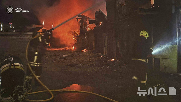 [키이우(우크라이나)=AP/뉴시스]우크라이나 긴급구조대가 4일 우크라이나 키이우에서 러시아의 공격으로 발생한 화재를 진압하고 있다. 러시아가 3일 밤부터 4일 새벽 사이 우크라이나 전쟁 시작 이후 최대 규모의 드론 및 미사일로 수도 키이우를 공격, 23명이 부상하고 키이우 곳곳에서 피해가 발생했다. 2025.07.04.