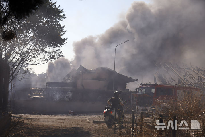 [로마=AP/뉴시스] 4일(현지 시간) 이탈리아 로마 외곽의 한 주유소에서 폭발이 발생한 뒤 연기가 피어오르고 있다. 이 사고로 지금까지 최소 9명이 다친 것으로 알려졌다. 2025.07.04.