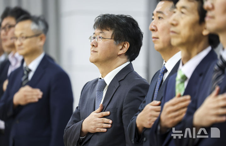 [서울=뉴시스] 김선웅 기자 = 김태훈 신임 서울남부지검장이 4일 서울 양천구 서울남부지방검찰청에서 열린 제24대 검사장 취임식에서 국기에 대한 경례를 하고 있다. 2025.07.04. [email protected]