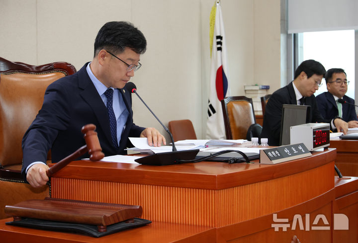[서울=뉴시스] 김금보 기자 = 안호영 국회 환경노동위원회 위원장이 4일 오전 서울 여의도 국회에서 열린 환경노동위원회 전체회의에서 국무위원후보자(김성환 환경부장관, 김영훈 고용노동부장관) 인사청문회 실시계획서 안건을 상정하고 있다. 2025.07.04. [email protected]