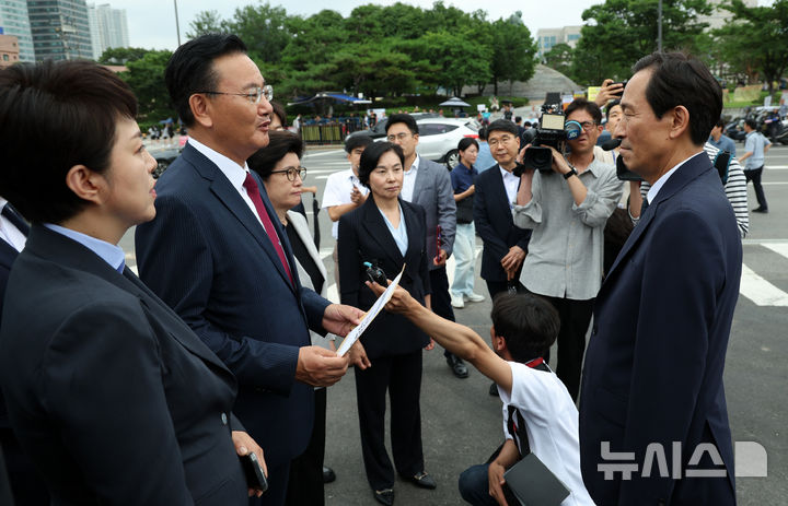 [서울=뉴시스] 고범준 기자 = 유상범 국민의힘 원내운영수석부대표와 김은혜 원내정책수석부대표가 4일 서울 용산구 대통령실 정문 앞에서 우상호 정무수석에게 특수활동비(특활비) 증액 요구 관련 항의서한을 전달하고 있다. 2025.07.04. [email protected] [email protected]