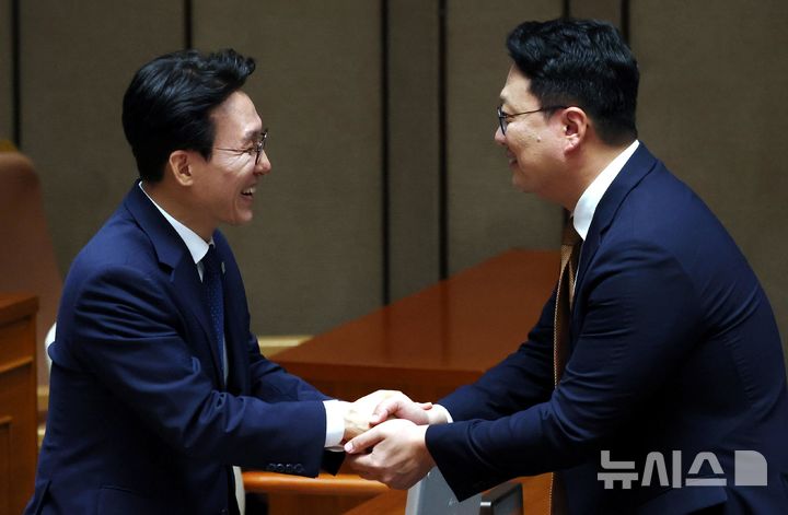 [서울=뉴시스] 조성봉 기자 = 김민석 국무총리가 4일 오후 서울 여의도 국회에서 열린 제426회 국회(임시회) 제5차 본회의에 앞서 천하람(오른쪽) 원내대표 겸 당대표 권한대행과 악수를 하고 있다. 2025.07.04. [email protected]