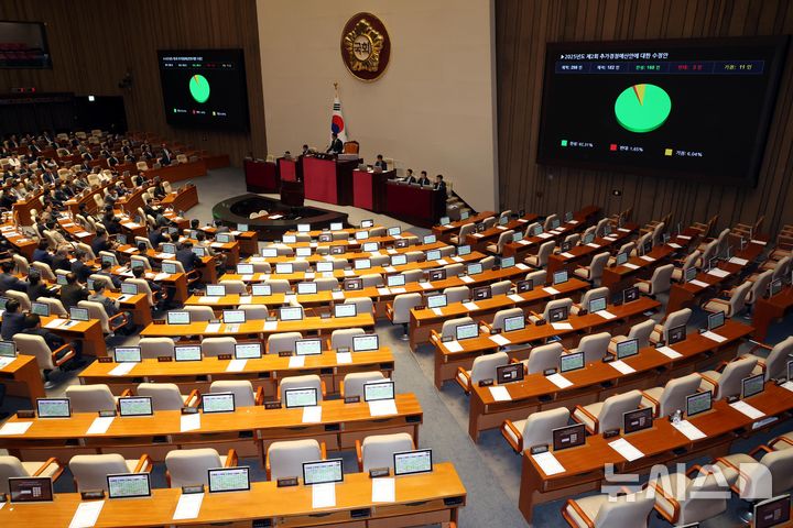 [서울=뉴시스] 조성봉 기자 = 4일 오후 서울 여의도 국회에서 열린 제426회 국회(임시회) 제5차 본회의에서 제2회 추가경정예산안 수정안이 재석 182인, 찬성 168인, 반대 3인, 기권 11인으로 가결되고 있다. 2025.07.04. [email protected]