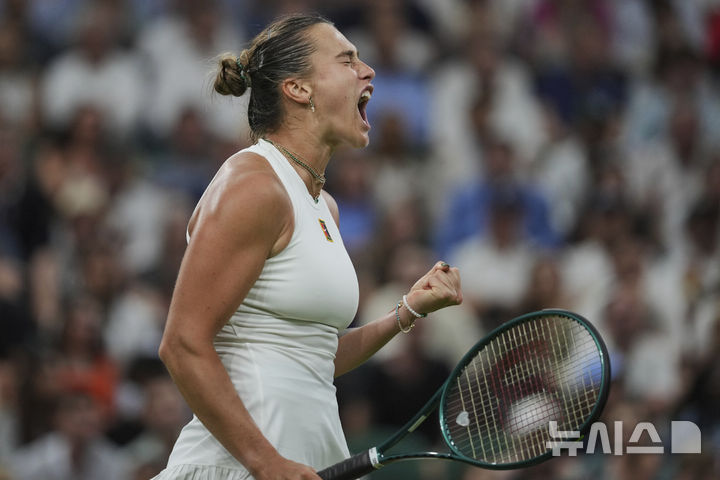 [런던=AP/뉴시스] 아리나 사발렌카(1위·벨라루스)가 4일(현지 시간) 영국 런던 올잉글랜드 클럽에서 열린 2025 윔블던 테니스 대회 여자 단식 3회전에서 에마 라두카누(40위·영국)와 경기하고 있다. 사발렌카가 2-0(7-6 6-4)로 승리하고 16강에 올라 엘리스 메르턴스(23위·벨기에)와 맞붙는다. 2025.07.05.