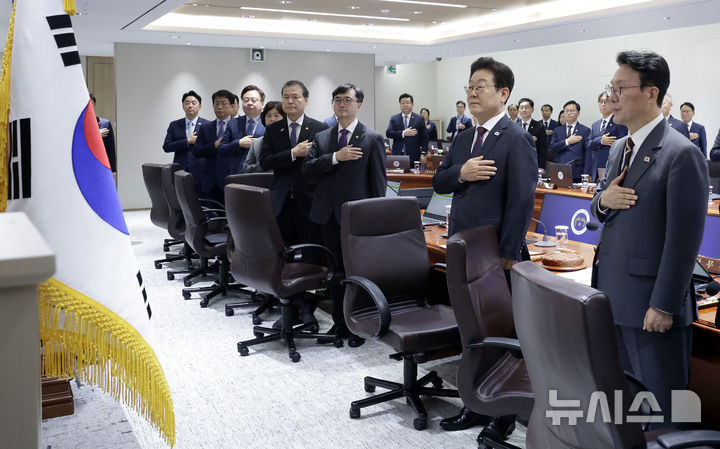 [서울=뉴시스] 최동준 기자 = 이재명 대통령이 5일 서울 용산 대통령실 청사에서 열린 국무회의에서 김민석 국무총리 등 참석자들과 국민의례를 하고 있다. 2025.07.05. [email protected]
