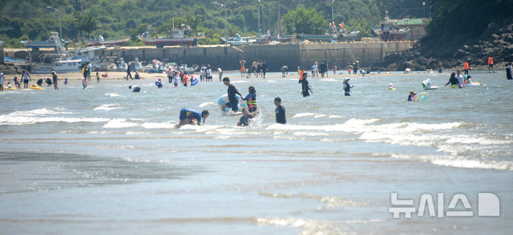 [부안=뉴시스] 김얼 기자 = 연일 무더위가 기승을 부리고 있는 5일 전북 부안군 변산해수욕장을 찾은 시민들이 물놀이를 하며 더위를 식히고 있다. 2025.07.05. [email protected]