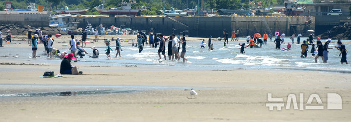 [부안=뉴시스] 김얼 기자 = 연일 무더위가 기승을 부리고 있는 5일 전북 부안군 변산해수욕장을 찾은 시민들이 물놀이를 하며 더위를 식히고 있다. 2025.07.05. [email protected]