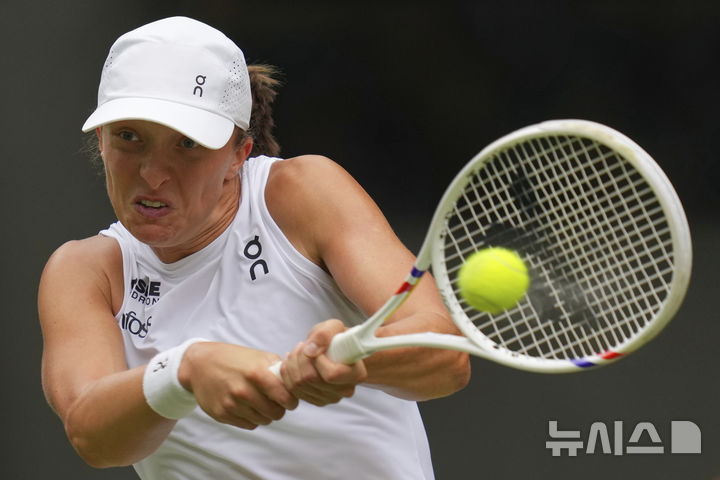 [런던=AP/뉴시스] 이가 시비옹테크(4위·폴란드)가 5일(현지 시간) 영국 런던 올잉글랜드 클럽에서 열린 2025 윔블던 테니스 대회 여자 단식 3회전에서 대니엘 콜린스(54위·미국)와 경기하고 있다. 시비옹테크가 2-0(6-2 6-3)으로 승리하고 16강에 올라 클라라 타우손(22위·덴마크)을 상대한다. 2025.07.06.