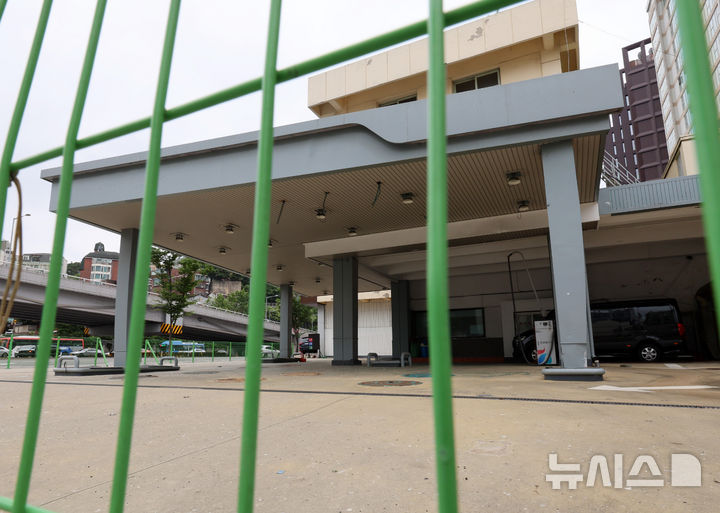 [서울=뉴시스] 이영환 기자 = 6일 서울 시내의 폐업한 주유소가 보이고 있다.