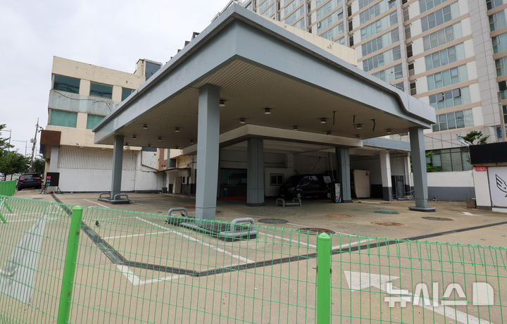 [서울=뉴시스] 이영환 기자 = 6일 서울 시내의 폐업한 주유소가 보이고 있다.