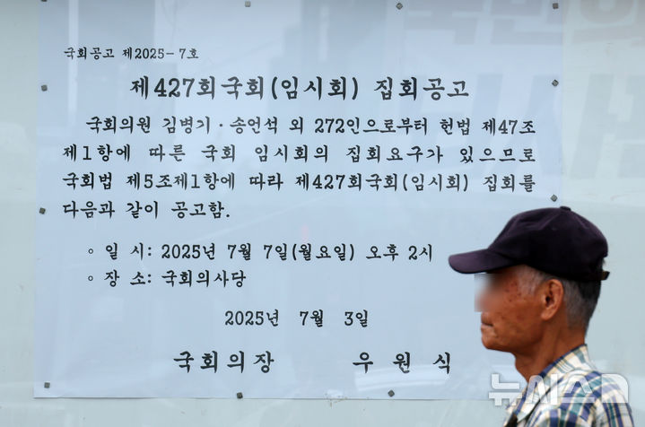 [서울=뉴시스] 고승민 기자 = 6일 서울 여의도 국회 앞에 제417회 국회(임시회) 집회 공고문이 게시돼 있다. 제417회 국회(임시회)는 오는 7일 오후 2시에 열린다. 2025.07.06. [email protected]