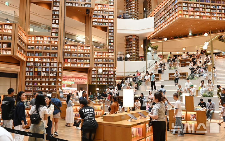 [수원=뉴시스] 김종택 기자 = 전국 대부분 지역에 폭염 특보가 발효된 6일 경기 수원시 장안구 '스타필드 수원' 별마당 도서관에 더위를 피해 나온 시민들로 북적이고 있다. 2025.07.06. [email protected]