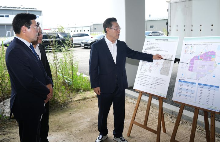[서울=뉴시스] 고승민 기자 = 김영록 전라남도지사가 6일 나주 에너지국가산단 조성 현장을 방문한 박찬대 더불어민주당 의원에게 전남도 현안 해결을 위한 건의 및 협조를 요청하고 있다. (사진=전남도청 제공) 2025.07.06. [email protected] *재판매 및 DB 금지