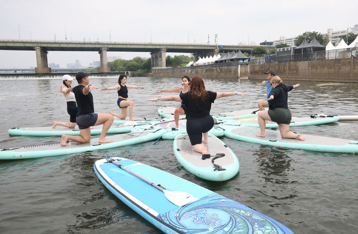 [서울=뉴시스] 최진석 기자 = 6일 서울 잠실 한강공원 수상지역에서 열린 2025 0APP월드투어 서울 SUP 오픈(이하 서울 SUP 오픈) 대회에서 시민들이 플로팅 요가 체험을 하고 있다.