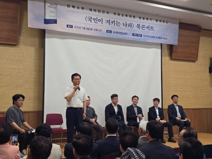 [서울=뉴시스] 고승민 기자 = 더불어민주당 당대표 선거에 출마하는 정청래 의원이 6일 전남 광주 김대중컨벤션 센터에서 열린 '국민이 지키는 나라' 북콘서트에서 발언하고 있다. (사진=이성윤 의원 SNS) 2025.07.06. [email protected]