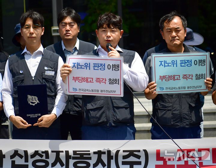 [광주=뉴시스] 이현행 기자= 김원우 금속노조 신성자동차지회장이 7일 오전 광주 서구 화정전시장 앞에서 열린 노조간부 계약해지 취소 원직복직 이행 촉구 기자회견에 참석해 발언하고 있다. 2025.07.07. [email protected]