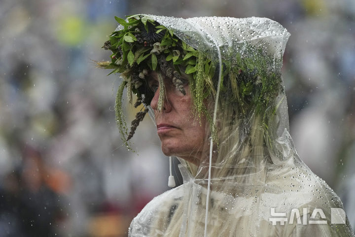 [탈린=AP/뉴시스] 6일(현지 시간) 에스토니아 탈린의 음악 축제 광장에서 열린 '이세오마 음악 축제'에서 한 여성이 비를 맞으며 공연을 관람하고 있다. 2025.07.07.