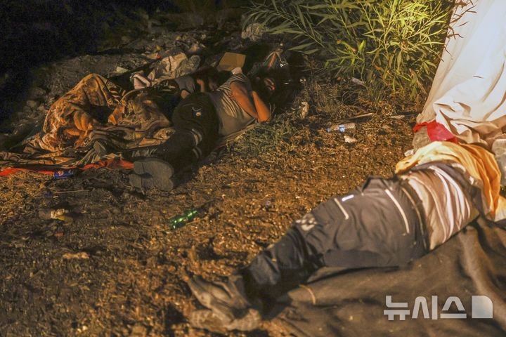 [라타키아=AP/뉴시스] 7일 새벽(현지 시간) 시리아 라타키아 외곽 라비아 인근 산불 현장에서 진화 작업을 하던 시리아 민방위대 '화이트 헬멧' 소속 대원들이 잠시 휴식하고 있다. 2025.07.07.