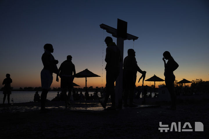 [글리파다(그리스)=AP/뉴시스]그리스 수도 아테네 남쪽 글리파다의 기온이 7일 40도를 넘을 것으로 예보된 가운데 6일 오후 더위를 견디지 못한 시민들이 야외에 설치된 샤워 시설에서 물줄기를 맞으며 더위를 식히고 있다. 그리스 당국은 7일 기온이 40도를 넘을 것으로 예상되는 일부 지역에 의무적 업무 휴식을 명령했다. 그리스의 폭염은 10일까지 이어질 것으로 예보됐다. 2025.07.07.
