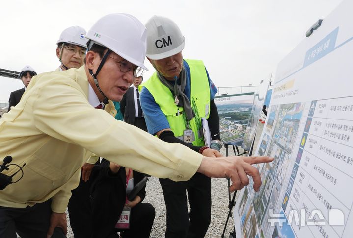 [세종=뉴시스] 강종민 기자 = 김민석 국무총리가 7일 세종시 세종동 국립도시건축박물관 건설현장을 찾아 폭염 대비 건설현장 근로환경을 점검하고 있다. 2024.07.07. [email protected]