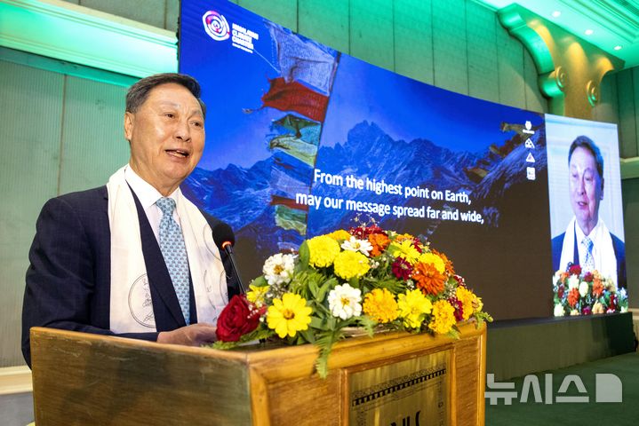 [카트만두=뉴시스] 사진공동취재단 = 강태선 BYN블랙야크그룹 회장이 5일(현지 시간) 네팔 카트만두에서 열린 '서밋 포 어스'에서 '히말라야 기후헌장 2025'를 발표하고 있다. 2025.07.07. [email protected]