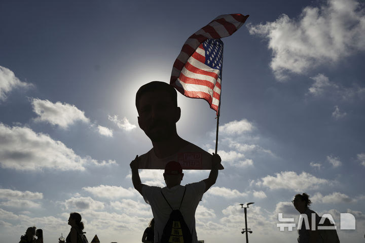[텔아비브=AP/뉴시스] 7일(현지 시간) 이스라엘 텔아비브에 있는 미국 대사관 분관 앞에서 하마스에 억류된 인질들의 석방과 휴전을 촉구하는 집회가 열리고 있다. 이날 집회는 도널드 트럼프 미국 대통령과 베냐민 네타냐후 이스라엘 총리의 워싱턴 회담을 앞두고 열렸다. 2025.07.08.
