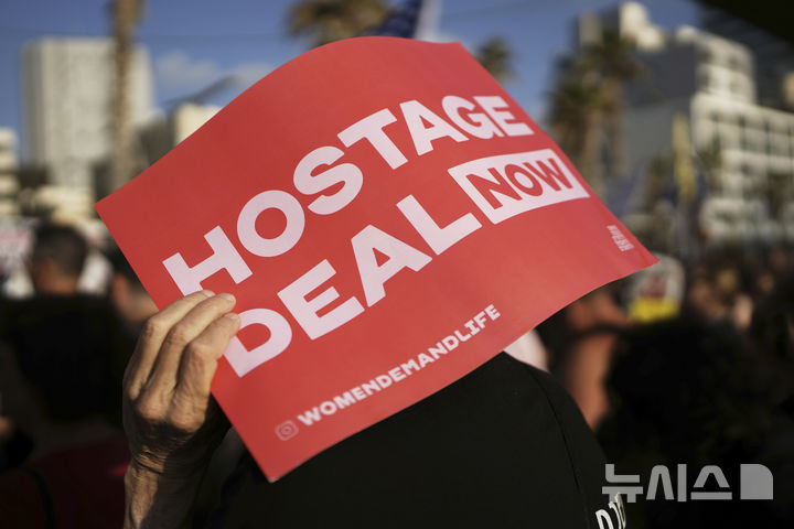 [텔아비브=AP/뉴시스] 7일(현지 시간) 이스라엘 텔아비브에 있는 미국 대사관 분관 앞에서 하마스에 억류된 인질들의 석방과 휴전을 촉구하는 집회가 열리고 있다. 이날 집회는 도널드 트럼프 미국 대통령과 베냐민 네타냐후 이스라엘 총리의 워싱턴 회담을 앞두고 열렸다. 2025.07.08.